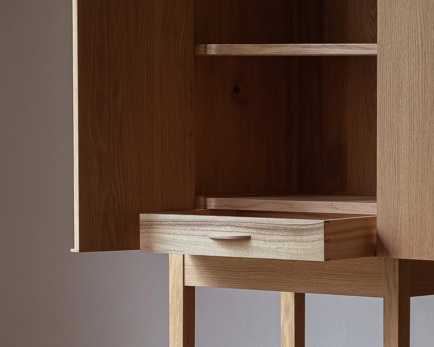 Drewno starannie i w sposób przemyślany dobrałem do poszczególnych elementów mebla. Konstrukcja szafki podporządkowana została naturalnym procesom pracy drewna, na które zostawia ona odpowiednią przestrzeń. Zastosowałem połączenia dające gwarancję trwałości obliczonej na pokolenia. Najwyższy możliwy poziom precyzji osiągnąłem dzięki najlepszym praktykom pracy narzędziami ręcznymi.