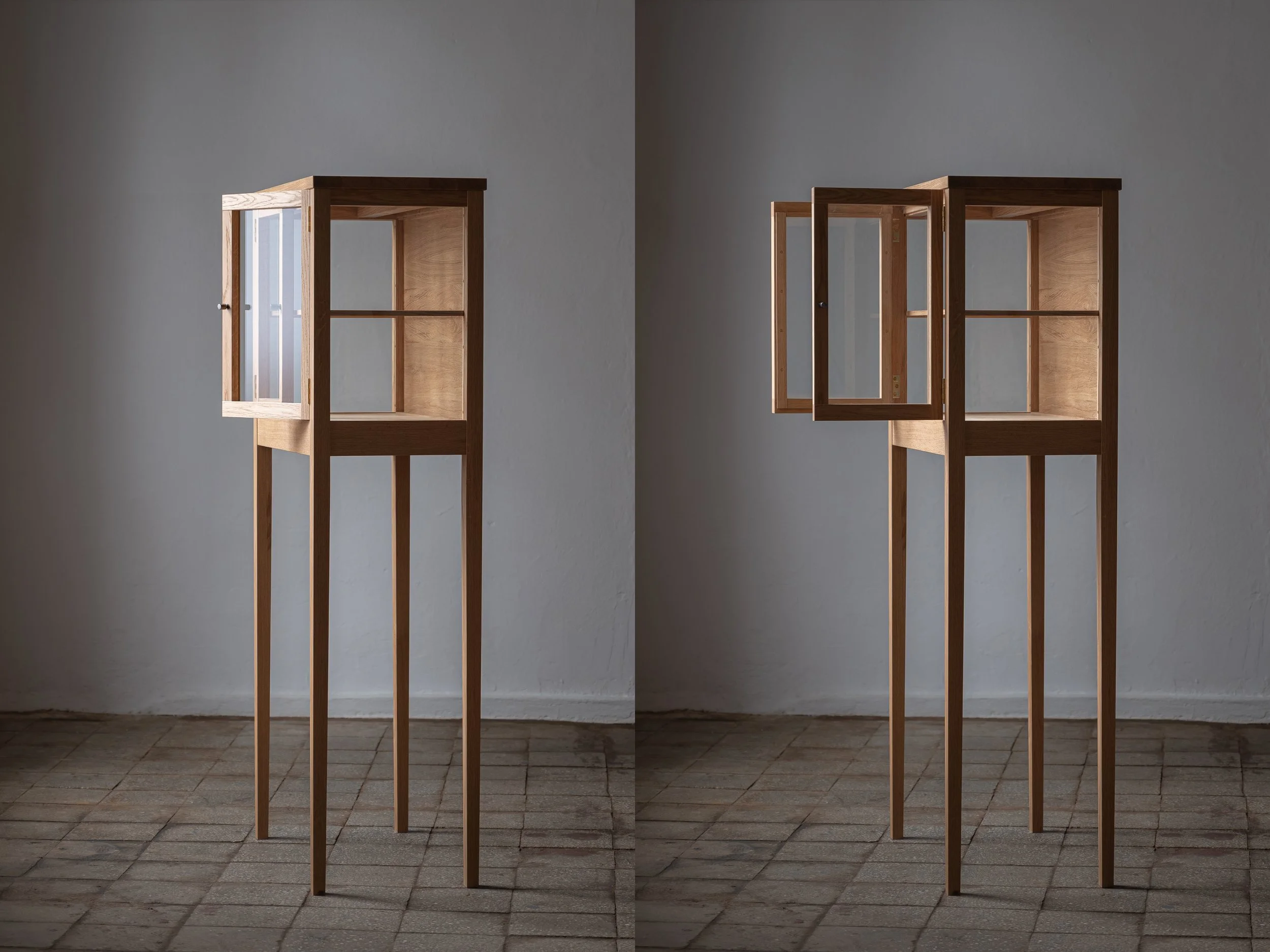 Minimalistyczna witryna wykonana z litego dębu. Konstrukcja oparta na wysokich nogach. Witryna wykonana za pomocą tradycyjnych połączeń stolarskich o wysokiej trwałości.